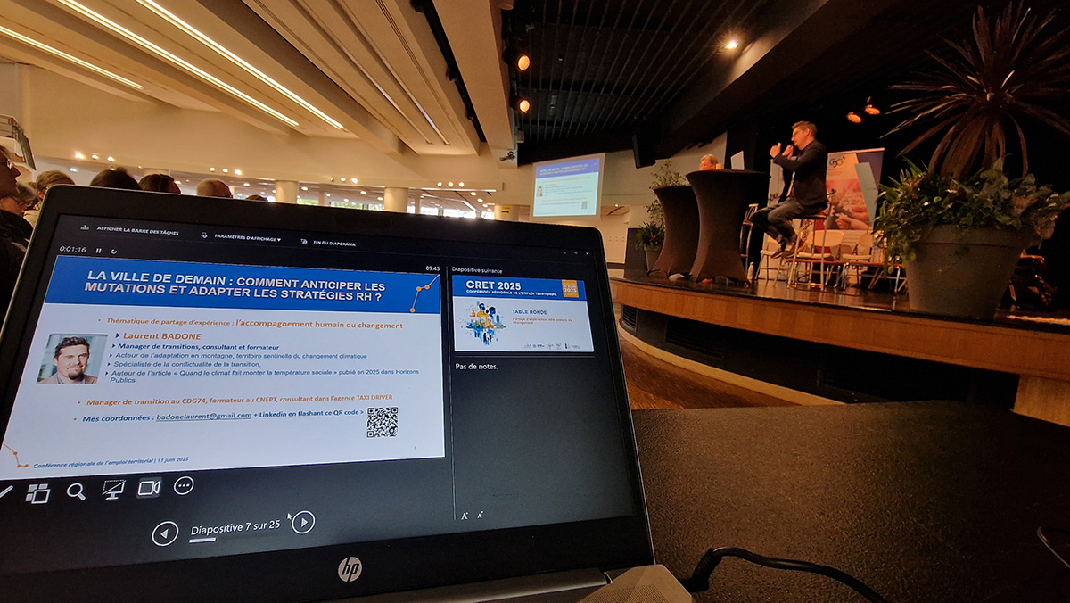 Lors d’une conférence, Laurent Badone, manager des transitions au CDG 74, a ensuite proposé une vision d’avenir de la ville de demain, en soulignant le rôle central des RH dans la réussite des transitions écologiques et sociales.