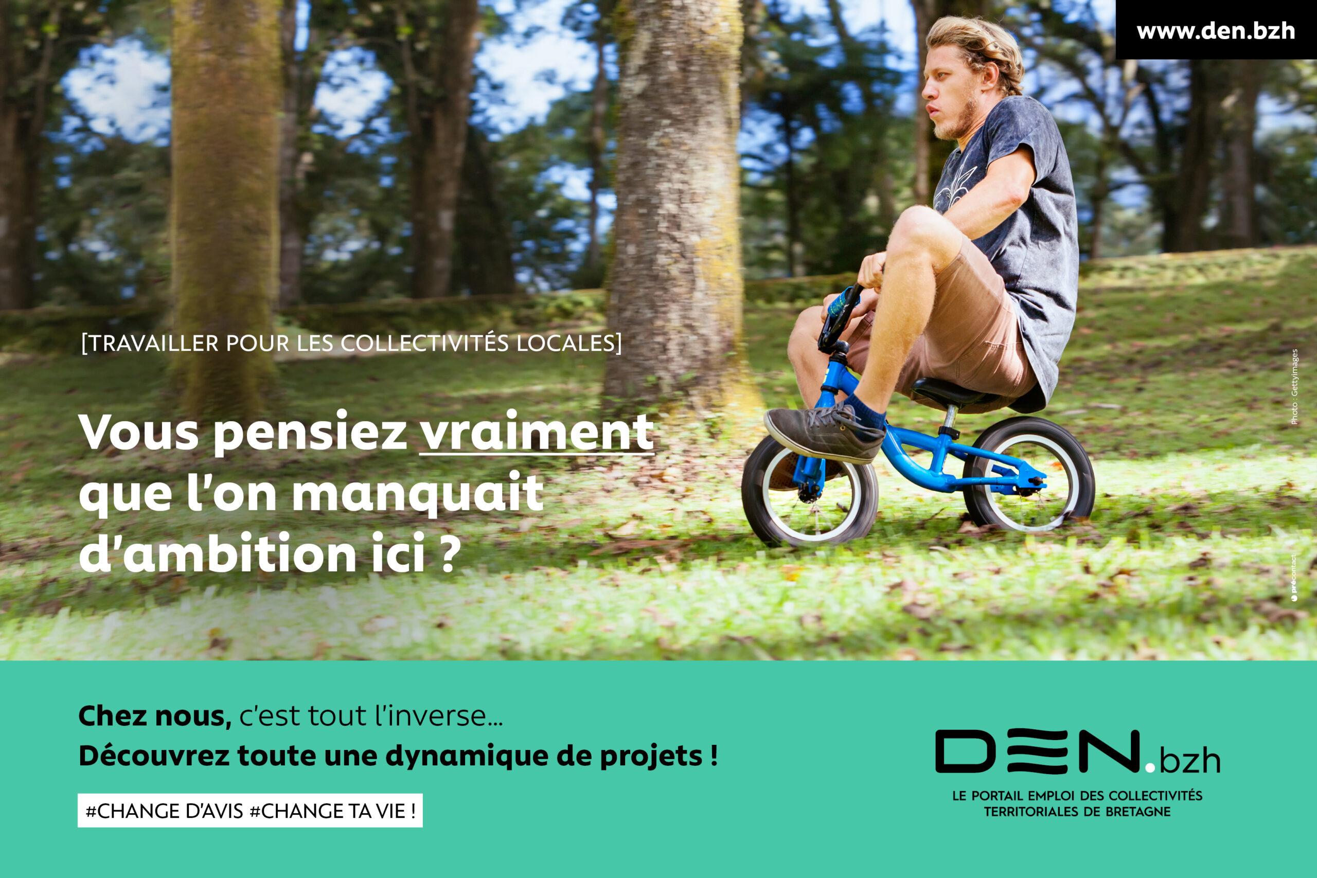 Visuel de la campagne de lancement de la marque DEN.bzh de janvier 2023 qui prend le contrepied des idées reçues sur la fonction publique territoriale (FPT). Ici, sur le supposé manque d’ambition de la FPT. © Droit réservé : CDG 22, CDG 29, CDG 35, CDG 56 -