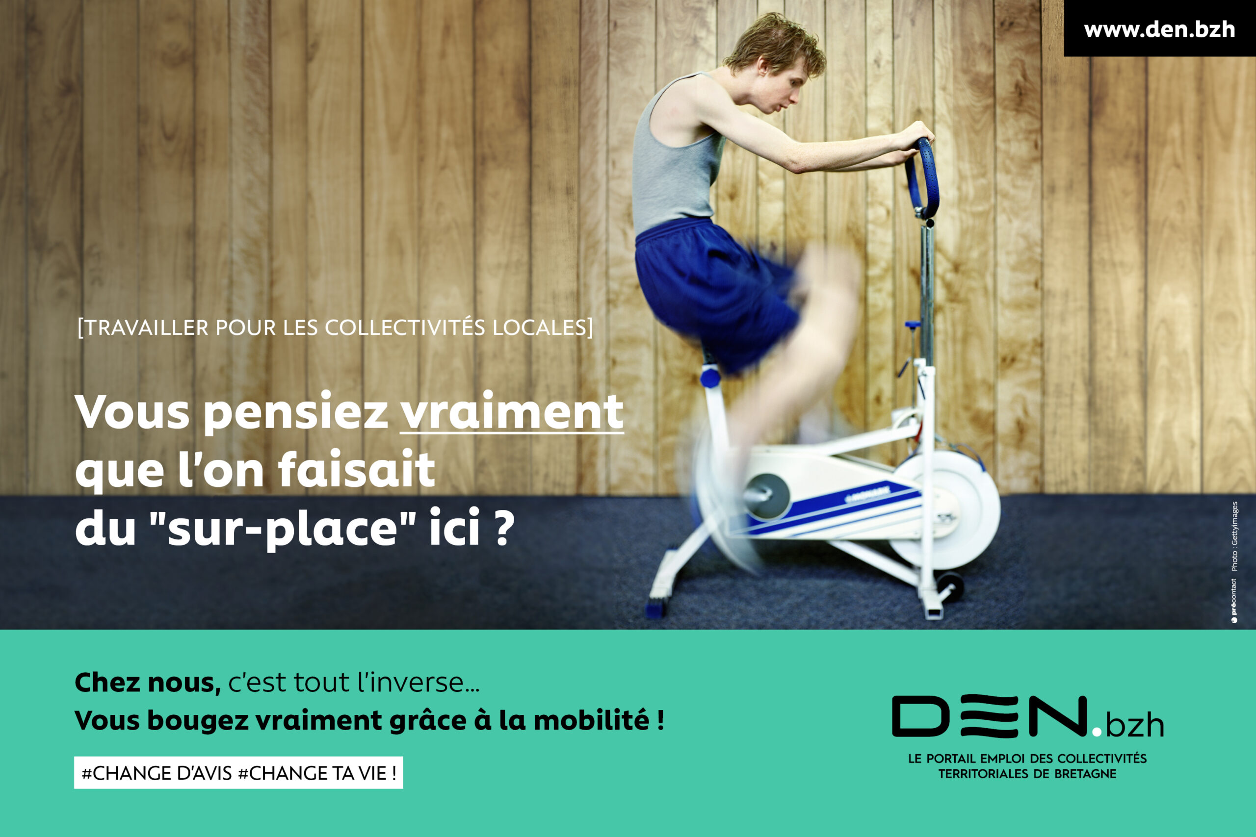 Visuel de la campagne de lancement de la marque DEN.bzh de janvier 2023 qui prend le contrepied des idées reçues sur la fonction publique territoriale (FPT). Ici, sur la fausse idée d’une mobilité lente, voire inexistante dans la FPT. © Droit réservé : CDG 22, CDG 29, CDG 35, CDG 56 -