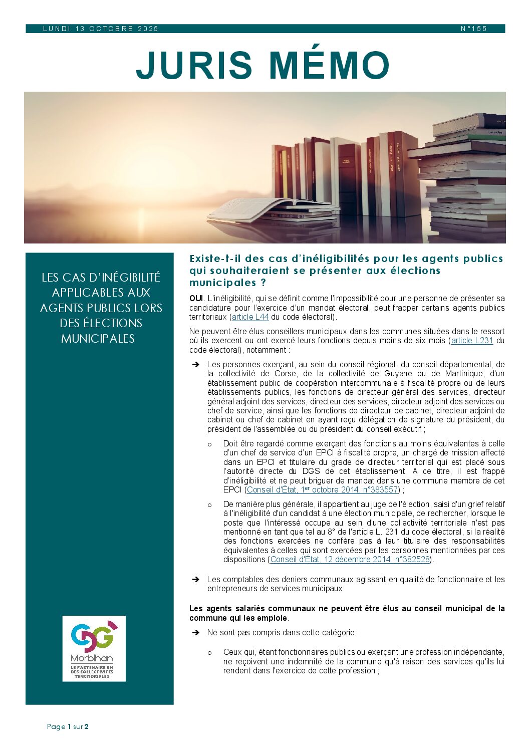 Juris Mémo n° 155 : Les cas d'inéligibilité applicables aux agents lors des élections professionnellesste-t-il des cas d’inéligibilités pour les agents publics qui souhaiteraient se présenter aux élections municipales ? Certains agents publics sont-ils exclus de ces cas d’inéligibilité
